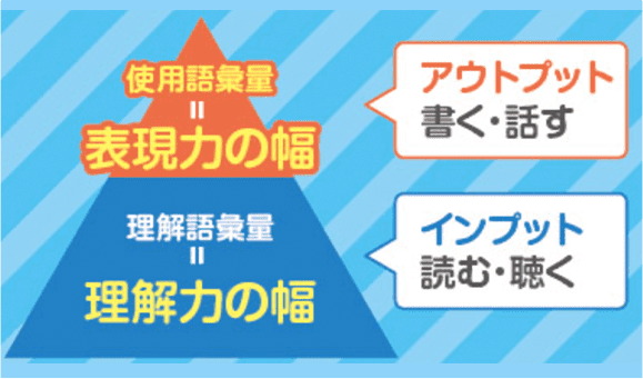 言葉を話したり、書いたりするためには、たくさんの語彙を「読む」・「聴く」というインプットをすることが必能です。読んでいた量が多ければ多いほど、「話す」「書く」等のアウトプットの時、様々な伝え方ができます。