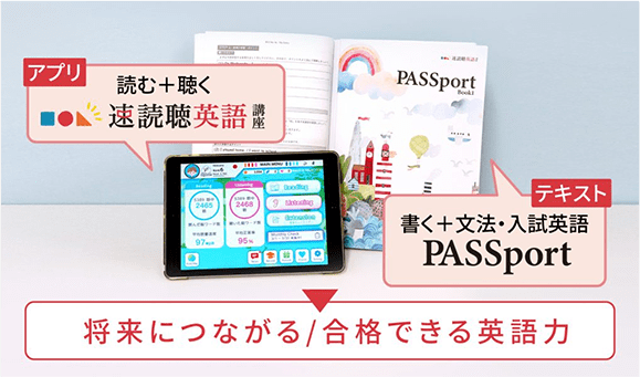 速読英語と併せてテキスト教材「PASSport」を活用することで、中学校入学後に特につまずきやすいポイントである「単語」「文法」「書く」を強化することができます。