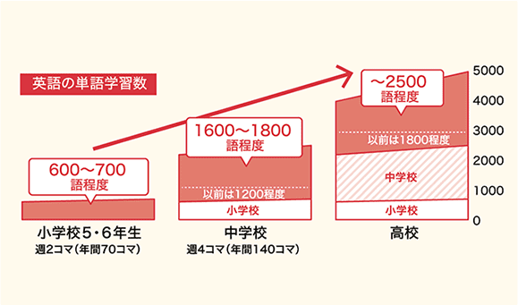 小学校5・6年生の英語の授業では600~700の単語を学習します。中学校・高校と進むにつれてさらに多くの単語を学ぶことになるだけでなく、授業も基本的に英語で進められるようになります。また、難しい定期テストも始まります。今のうちからしっかりと英語の基礎を作って準備をして、中学入学時から英語を得意科目にしましょう。