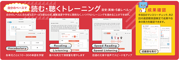 英文を前から理解するための英語長文読解力を身につけ、これからの英語教育や、入試対策に対応するための「読む力」と「聴く力」を鍛えます。