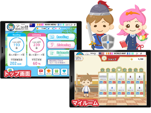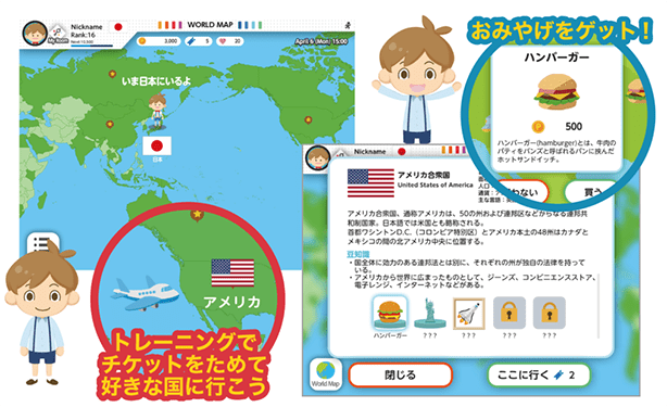 トレーニングでためた仮想通貨で、交換したチケットで仮想の世界旅行を楽しめます。訪れた国のアイテムをお土産として買うことができ、マイルームへコレクションしていくことができます。訪れた国の情報を知ることができるので異文化学習にもつながります。